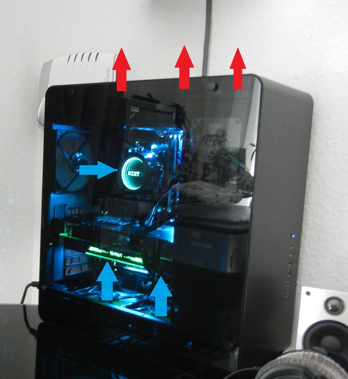Wie man auf dem Foto sieht, pusten 2 Lüfter kühle Luft nach oben auf die Grafikkarte, der Lüfter hinten kühle
