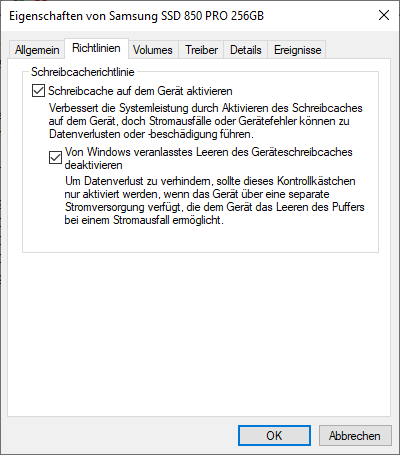 Es ist nur Schreibercache auf dem gerät aktivieren an das "von windows veranlasstes leeren des geräteschreibercahces deaktivieren ist aus.
