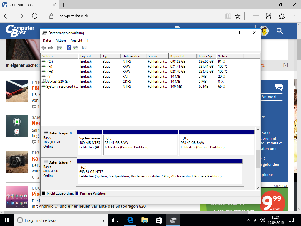Nun läuft Win10 wieder und ich habe ein der Datenträgerverwaltung die SSD, die HDDs als eine Platte mit allerdings 3 Partitionen, eine davon System reserviert (ist das wieder der BootManager?). Zugriff habe ich allerdings immer noch auf keine Daten.