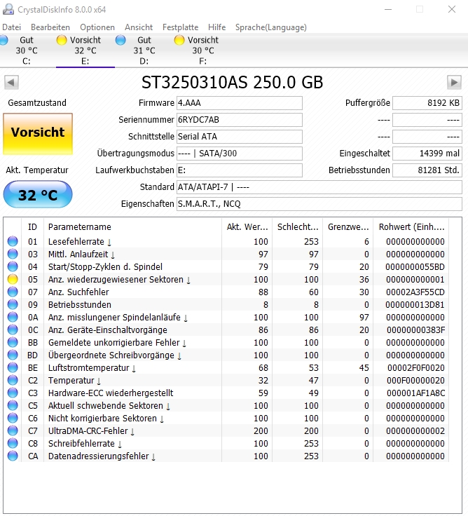 Festplattenmodel : Seagate Barracuda ( ST3250310AS)