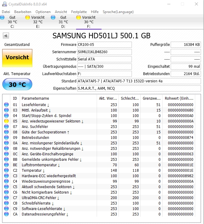 Die E Festplatte war gar nicht mehr da und als ich bei der Datenträgerverwaltung schaute, sollte ich MBR oder GPT neu setzen. Das tat ich erstmal nicht und habe statt dessen über Knoppix geguckt, was es bei der E Platte noch zu holen gibt. Unter Knoppix war sie(ohne Laufwerksbuchtaben) zu sehen und ich konnte auch ganz easy alle Daten retten. Habe sie danach formatiert und sie funktioniert auch wieder bestens.