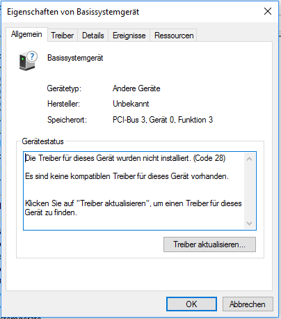 Seitdem wird im Geräte Manager unter Andere Geräte dreimal Basissystemgerät aufgeführt wo dann folgendes steht: