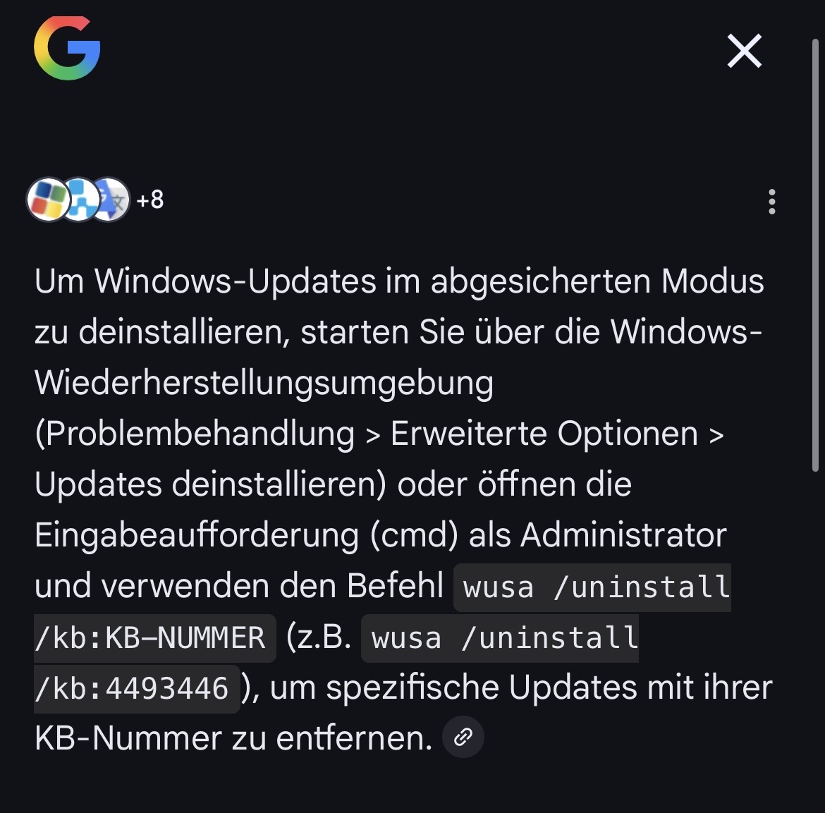 Okay? Das ist aber eine andere KB als vorherBFF schrieb:Wenn das die ist welche Du vorher entfernt wurde hast Du oder besser das OS nicht nur ein Problem