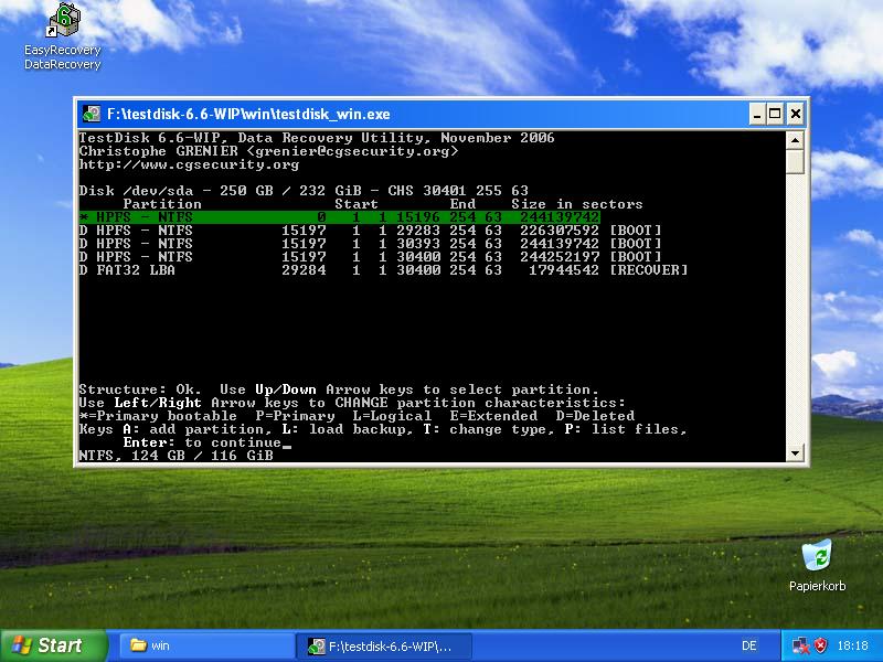Starte Testdisk bestätige bei dem Log-Datei-Screen mit Enter, wähle deine betroffene Festplatte aus und bestätige mit Enter, bestätige bei Partition Table Typ Intel, bestätige bei Analyse mit Enter und setze mir einen Screenshot.