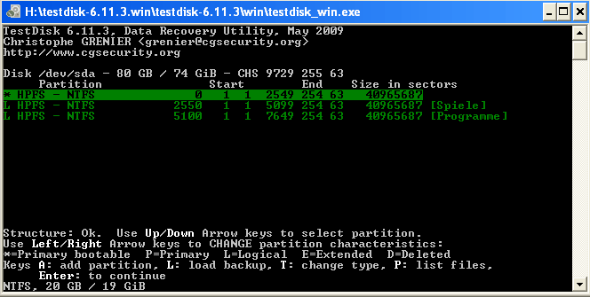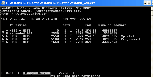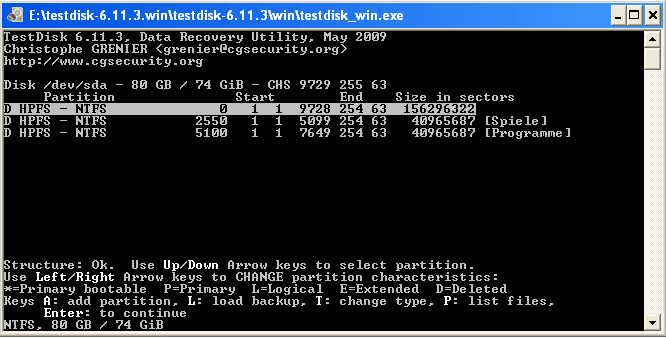 Leider hat diese Aktion meine Partitionen gelöscht. Testdisk zeigt mir folgendes an,