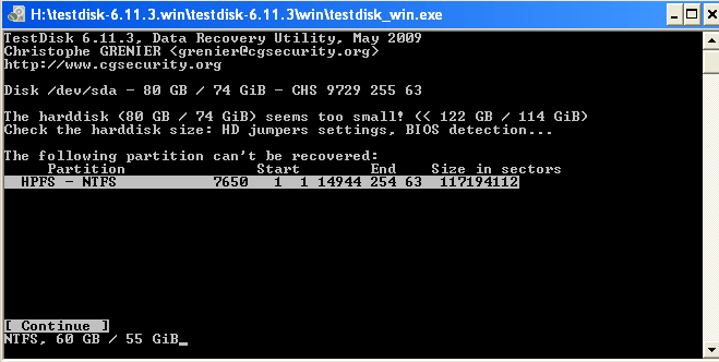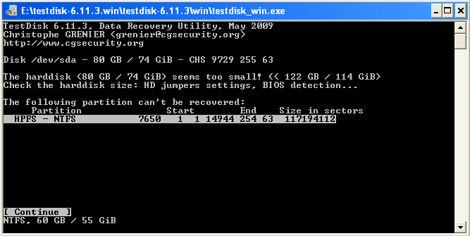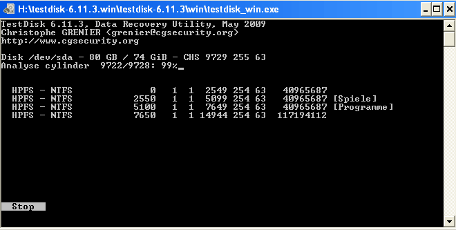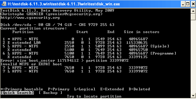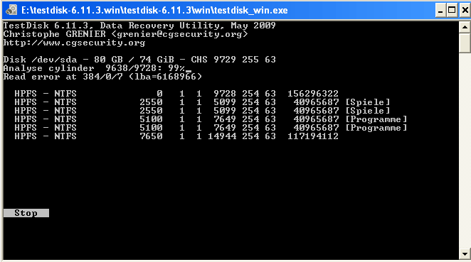 Die Platte ist in insgesamt vier Partitionen( je 20 GB) unterteilt. Bei dem scan mit Testdisk wurden mir( vor der Fehlermeldung) drei davon auch angezeigt. Lediglich die letzte und leider auch wichtigste nicht, da hier die Größenzuordnung wohl nicht stimmt.