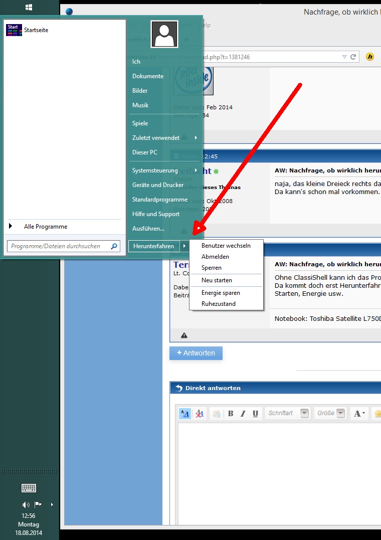 Manchmal passiert es aber, dass ich versehentlich auf den "Herunterfahren-Knopf" komme, wenn ich eigentlich nur das kleine Dreieck neben diesem Button anklicken möchte.