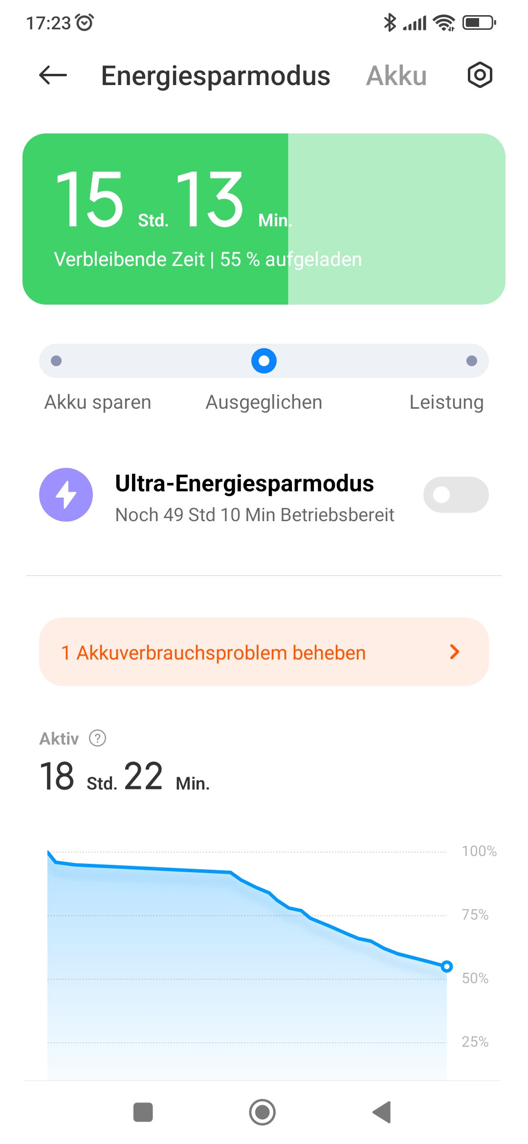 Ich schalte das Gerät nicht aus. Nachts sind Flugzeugmodus und WLAN aktiv. Ich habe aber auch nicht viele Apps installiert.