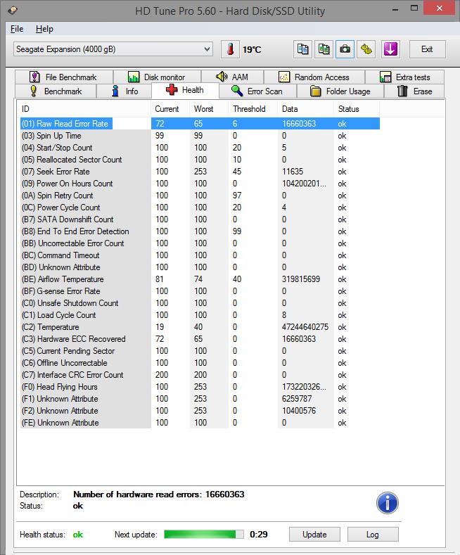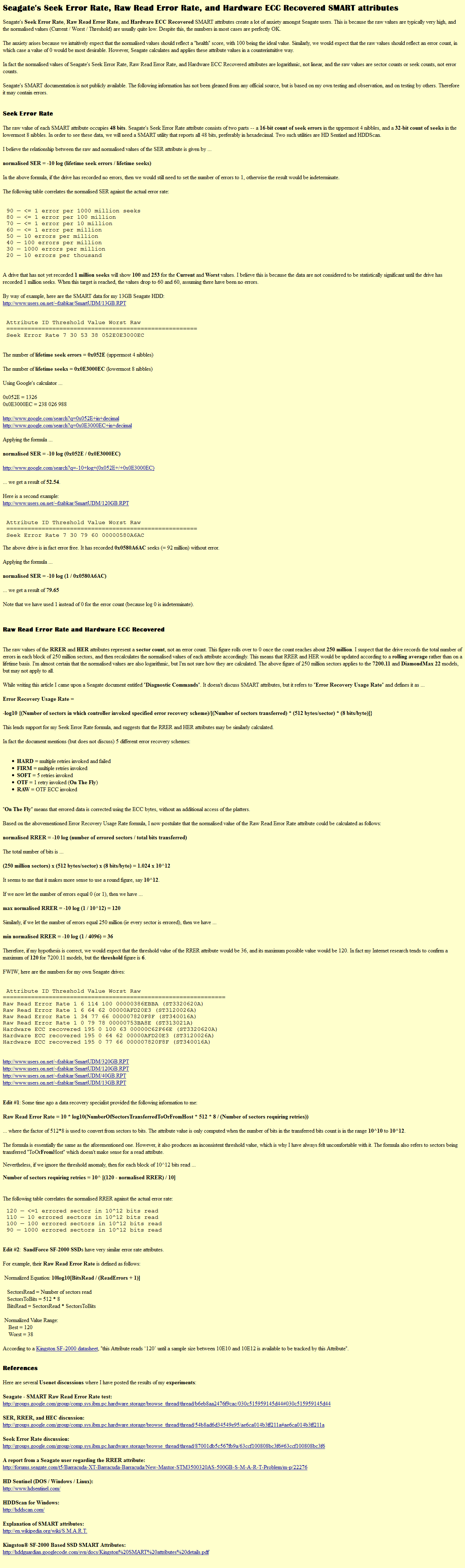 Die SMART-Werte werden bei Seagate-Platten etwas anders berechnet und sind auch entsprechend zu interpretieren. Besonders die Werte Seek Error Rate, Raw Read Error Rate und Hardware ECC Recovered sind dabei in einigen Fällen auffällig (hoch).