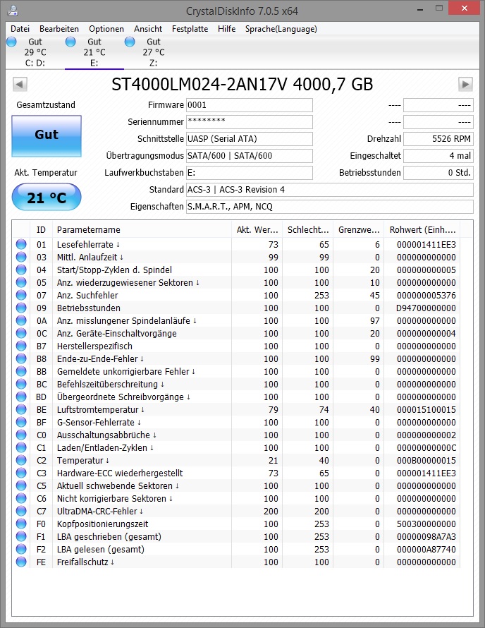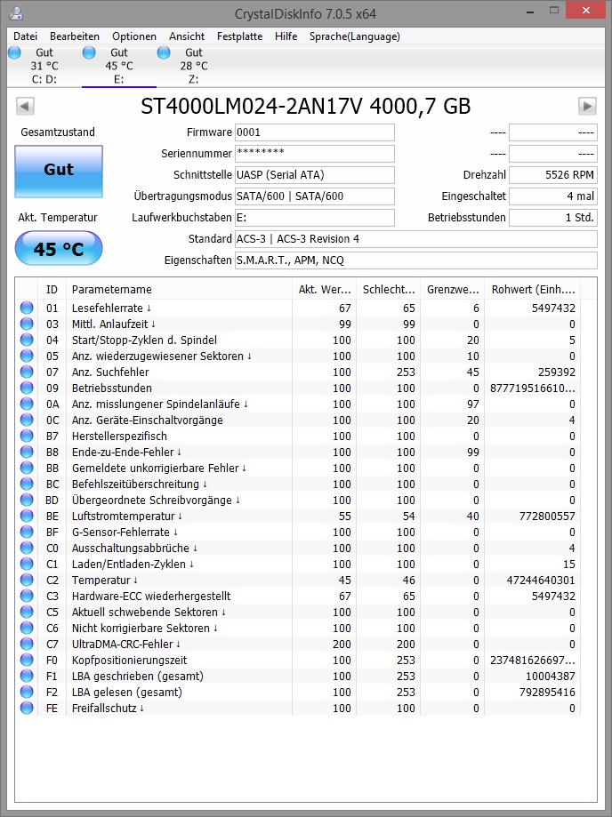Programme von Drittherstellern haben allerdings nicht die Möglichkeit, vollständig auf alle auszuwertenden Parameter von HDDs zuzugreifen und liefern daher oft inkonsistente oder ungenaue Ergebnisse. Wir empfehlen daher, HDDs grundsätzlich mit dem jeweiligen Hersteller-Tool (in unserem Fall SeaTools) zu checken!