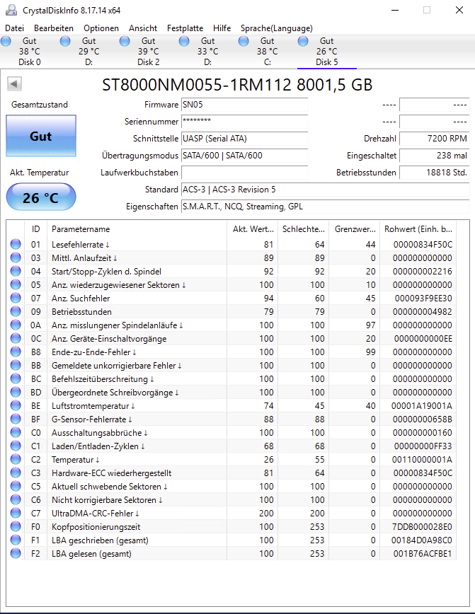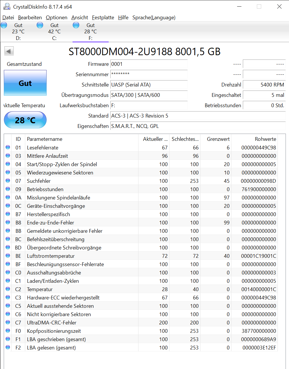 habe bisher hauptsächlich etwas Erfahrung mit den externen HDD von Toshiba und Western Digital. Ich weiß, dass die Smart Werte bei Seagate etwas anders zu lesen sind, wundere mich aber dennoch über einige "niedrige" Werte und wollte Seagate Nutzer fragen ob das so ok ist ?