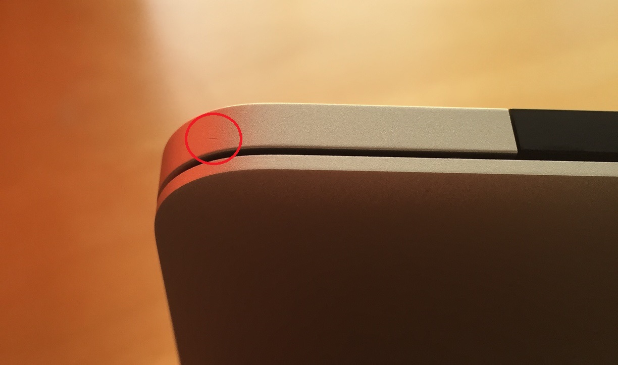 2. Nach einigen Tagen der (wirklich vorsichtigen) Benutzung auf dem Schreibtisch und auf dem Sofa sind mir zwei kleine Kratzer aufgefallen, einer direkt links neben der "Ä"-Taste (ca. 1mm lang), der andere hinten links in der Rundung (da, wo das Display im aufgeklappten Zustand überlappt; ebenfalls ca. 1mm lang). Und auch hier die Frage: ist das normal?