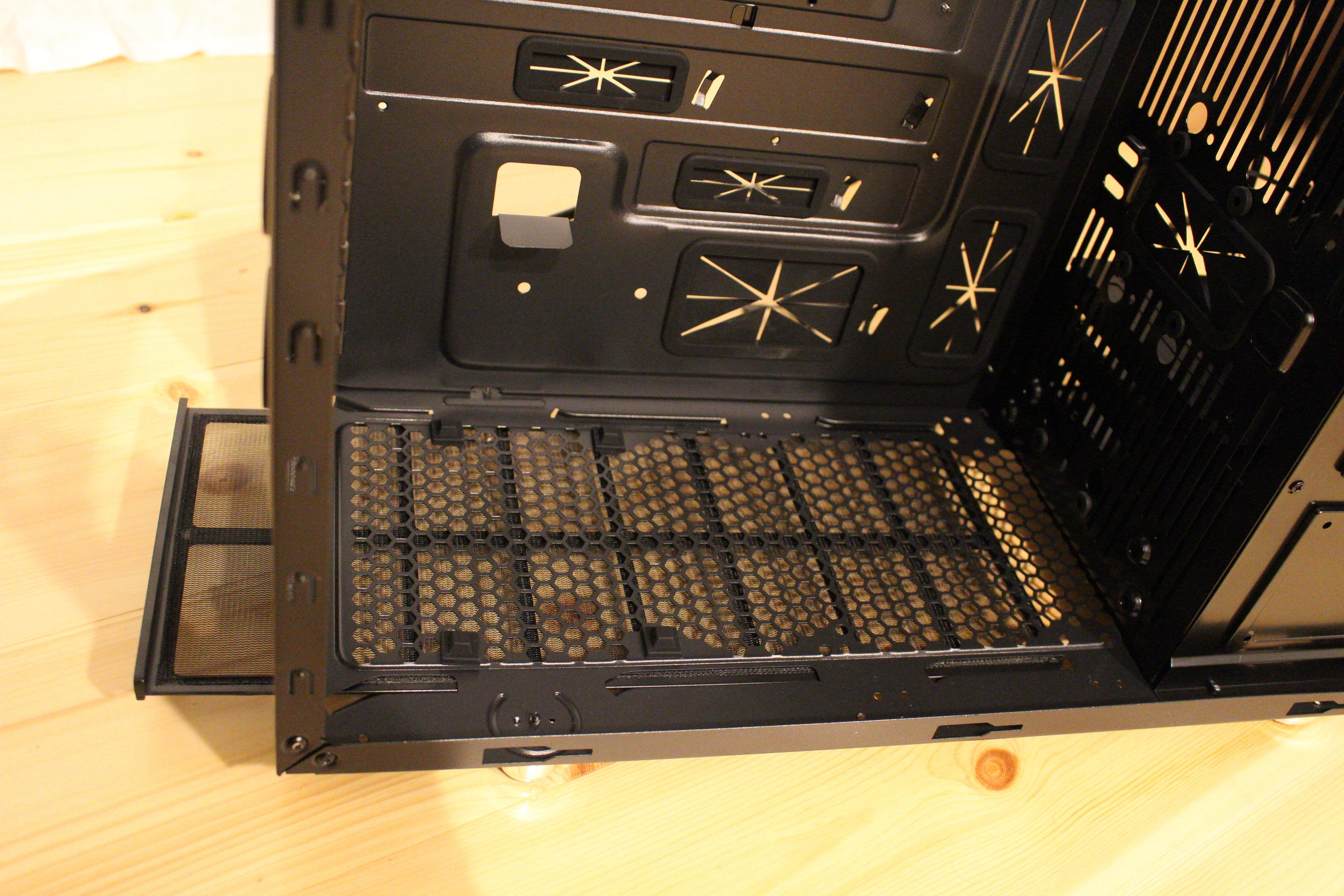 Staubfilter gibt es in diesem Gehäuse nun an jedem Lüfterplatz, der normalerweise nach innen gerichtet sein würde, sprich: unten und vorne (im Deep Silence 3 war unten noch kein Staubfilter vorhanden). Der Staubfilter unten ist sehr einfach zu entnehmen durch einfaches Herausziehen über die Rückseite. Bei dem Staubfilter vorne wird das ganze schon etwas schwieriger – zuerst muss das Frontpanel abgenommen werden, der Staubfilter abgeschraubt werden, um dann noch einzeln die am Staubfilter befestigten Lüfter abzuschrauben, nur um diese nach erfolgreicher Reinigung wieder anzuschrauben. Dort hätte ich mir eine praktischere Methode gewünscht, wie z.B. getrennte Halterungen für Lüfter und Staubfilter.