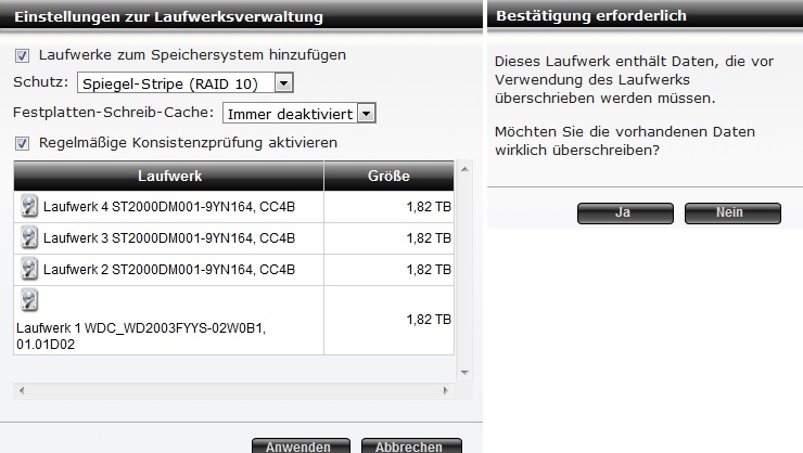 Ich nehme an, ich muss auf Laufwerke zum Speichersystem hinzufügen gehen, wo dann anschließend die Meldung "Möchten Sie die vorhandenen Daten wirklich überschreiben?" - siehe Screenshot.