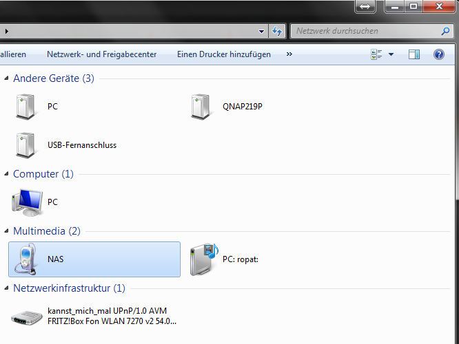 Im Anhang hab ich noch ein Bild meiner Netzwerkumgebung angehängt. Da seht ihr, dass das NAS zwar unter "andere Geräte" und "Multimedia" gelistet ist, aber unter "Computer" fehlt der Eintrag. Klicke ich auf das Symbol unter "Andere Geräte" komme ich nur ins Web-IF des NAS, klicke ich auf das bei "Multimedia", dann komme ich zu diesem Twonky-Server. Früher konnte ich auf das Symbol unter "Computer" klicken und kam dann in eine Art EXplorer-Ansicht, wo ich die Dateien des NAS sehen konnte.