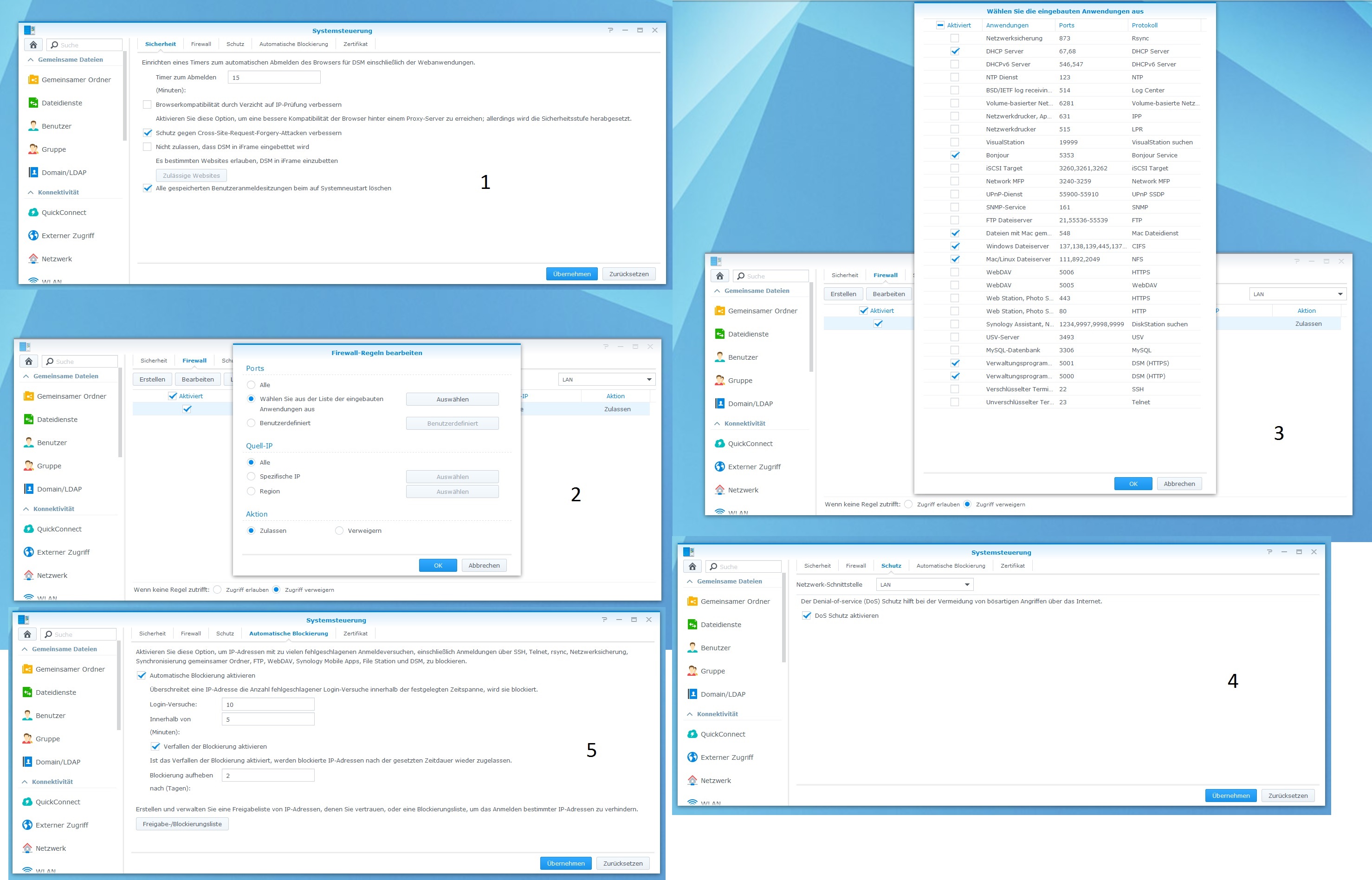 Wenn die Diskstation keine Zugang nach außen (außerhalb des Netzwerkes hat), benötigst du keine Firewall und die ganzen anderen Einstellungen. DoS Schutz ist ebenfalls nicht nötig. Der ganze Punkt Sicherheit ist nur interessant wenn du von "außen" auf die Diskstation zugreifen möchtest.