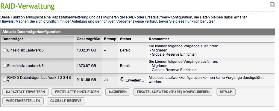 Ich habe ein TS-809 Pro , Build ist 3.8.2 Build 20130301. Es war ein RAID 5 aufgebaut mit 5 Platten a 2 TB, mit Bitmap. Die Konfiguration lief über zwei Jahre einwandfrei. Ich habe eine typgleiche 2TB HD zusätzlich eingesetzt um das RAID 5 auf 6 Platten zu erweitern. Dies habe ich in der RAID Verwaltung und "Festplatte hinzufügen " vor ca. 70 Stunden gestartet. Bislang ist der Prozess nicht abegschlossen, ich mache mir da ein wenig Sorgen . Im Status sehe ich auch keine "Prozentangaben mehr zum Fortschritt" sondern nur "Erweitern". Ich habe den Screenshoot dazu beigefügt, ebenso den Status aus dem Systemlog.