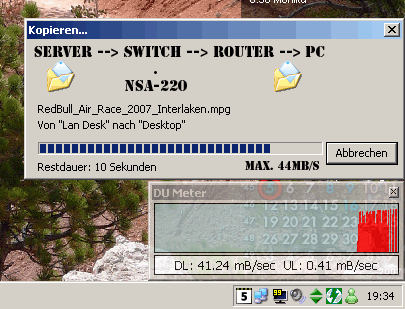 Zur Zeit schafe ich max. 6-8MB/s zum NSA 220 und DL 11MB/s, seit dem letzen Firmware Update das ich aufgespielt habe unterstütz er nun auch Torrent welcher aber leider öfters nicht richtig läuft er hängt sich einfach auf und zeigt immer den selben Speed an.