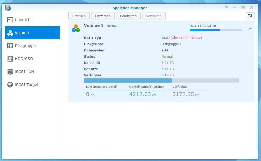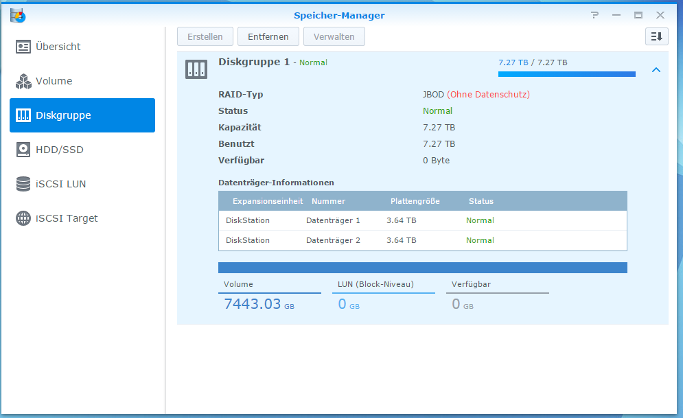 Allerdings bin ich mir über die aktuelle Festplattenplanung noch nicht so ganz im Klaren. Momentan habe ich die beiden Platten in meiner NAS einfach als jeweils eigenständige Festplatten. Das ist deshalb nervig, weil ich meine Daten immer hin und her kopieren muss, was durchaus mehrere Minuten dauert (ich lade z.B. immer automatisiert auf Festplatte 1 und muss das File dann in einen Ordner auf Festplatte 2 kopieren, weil es dort gemäß meiner Ordnerstruktur hingehört