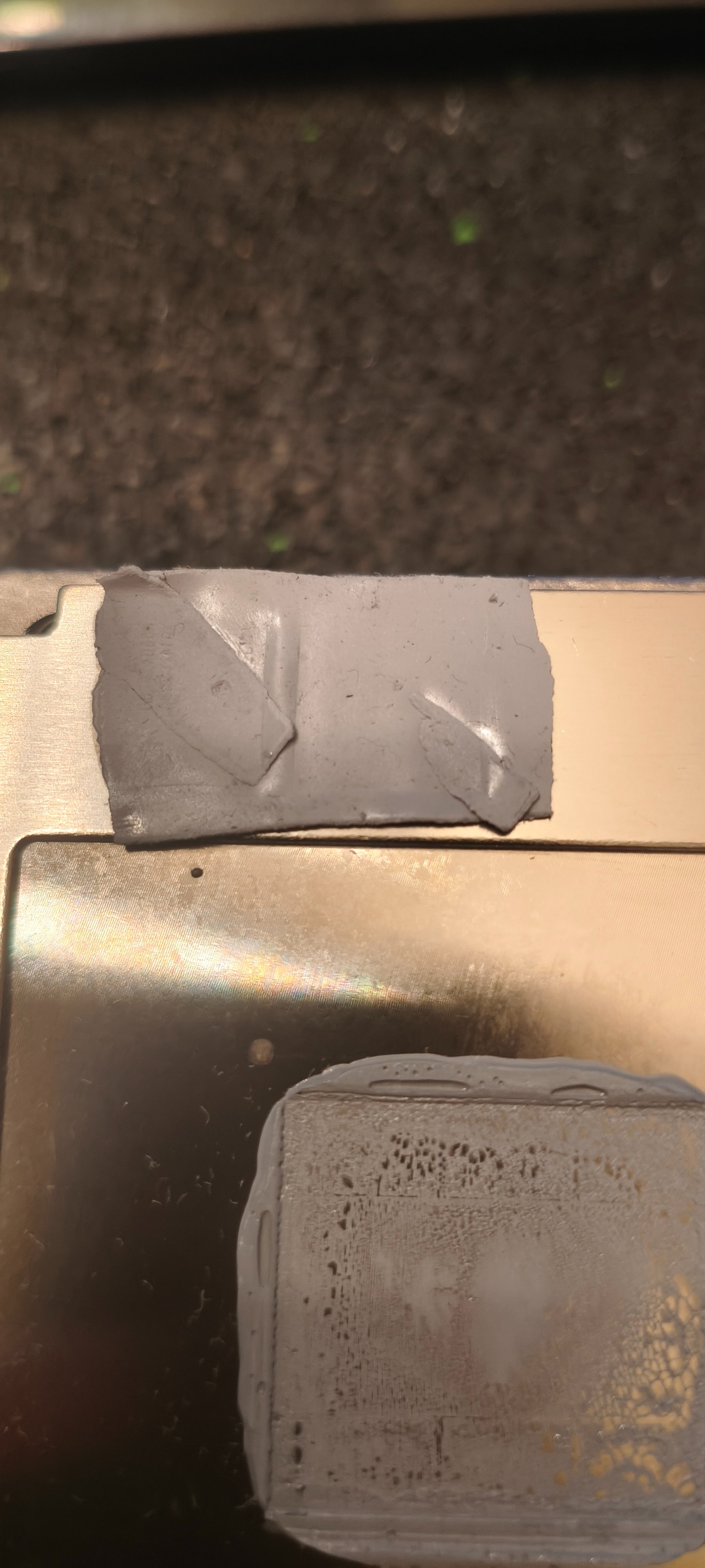 Sehr viel zum abkleben ist da auch nicht, auch wenn ich eher mehr als zu wenig machen würde. Bin mir nur nicht sicher ob 0,4 oder 0,5mm Blech. Ich tendiere eher zu 0,5mm, weil 0,1mm Kupfer besser Wärme übertragen sollte als 0,1mm PTM7950. Zu viel Kupfer darf es natürlich auch nicht sein, weil sonst der Chip mehr Lücke hat. Ich bin mir da noch unschlüssig.