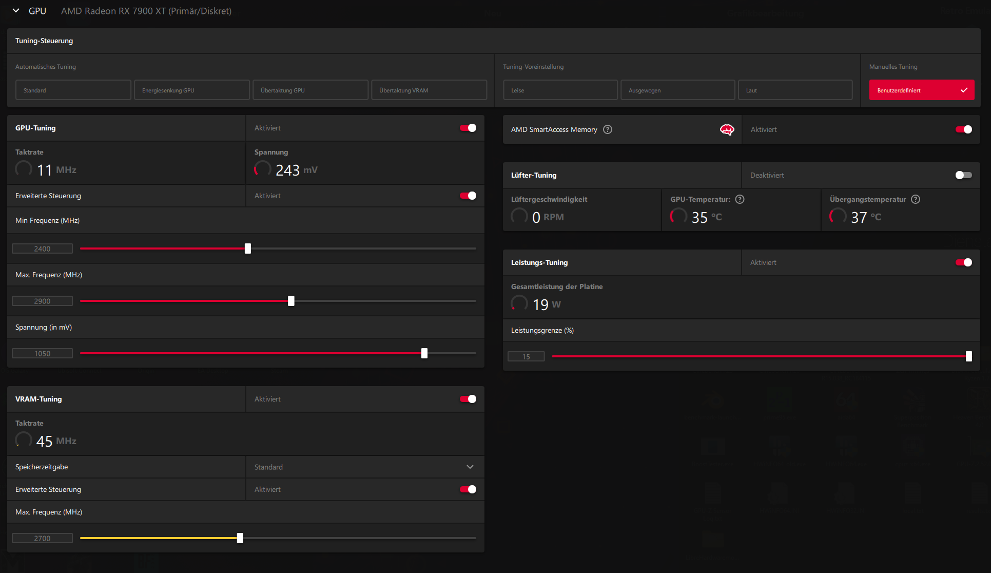 bei meiner alten asus tuf 6900xt war es relativ einfach, habe die frequency reduziert und undervolting so weit gesetzt, sodass alle spiele stabil liefen. und hatte ruhigen effizienten betrieb mit 230-250w verbrauch laut overlay.