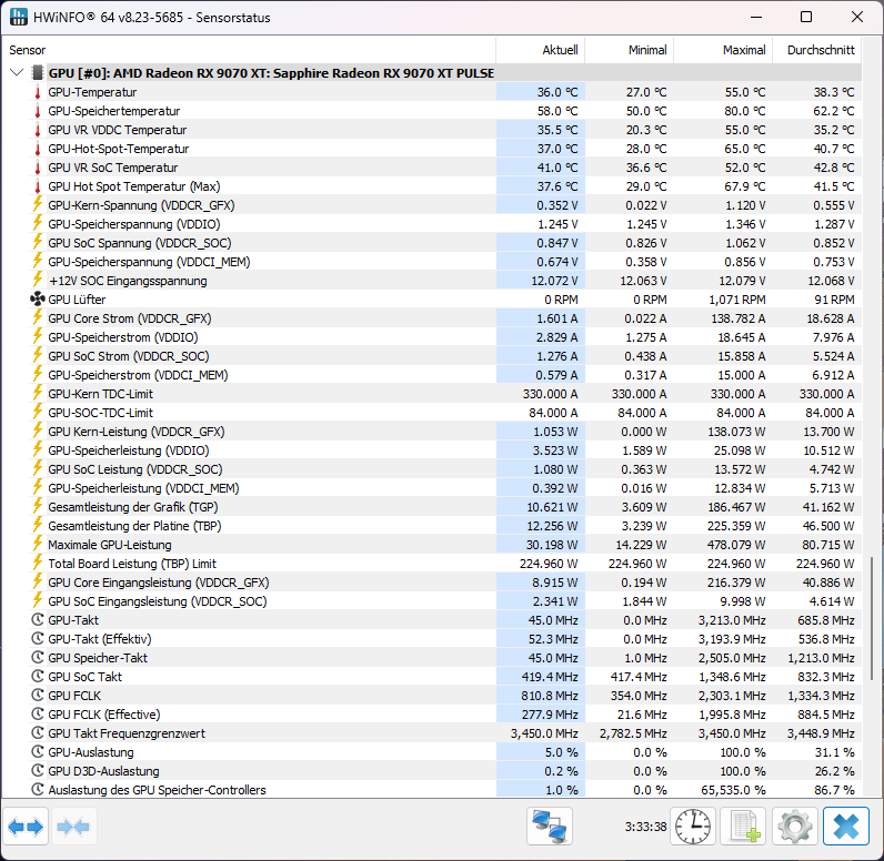Max. Temp für GPU 55°C, Hotspot 65°C, VRAM 80°C. Lastspitzen bei bis zu 478 W. Maximaler GPU Takt der anlag waren 3213 MHz 😮 Die Lüfter liefen mit max. 1071 upm.