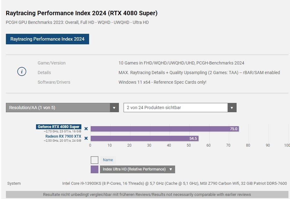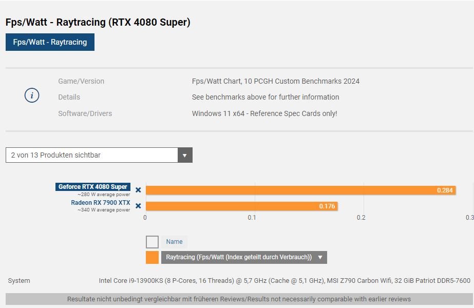 Keine Ahnung von wann du die Bilder hast oder wann der Test gemacht worden ist, aber ich zeig dir mal die Daten aus dem 4080 Super Test von PCGH.SweetOhm schrieb:Im RR (Raster) liegt die 7900XTX noch vor einer 4080 SUPER, ist dabei ca. 100 € günstiger bei 355 vs. 320 Watt.