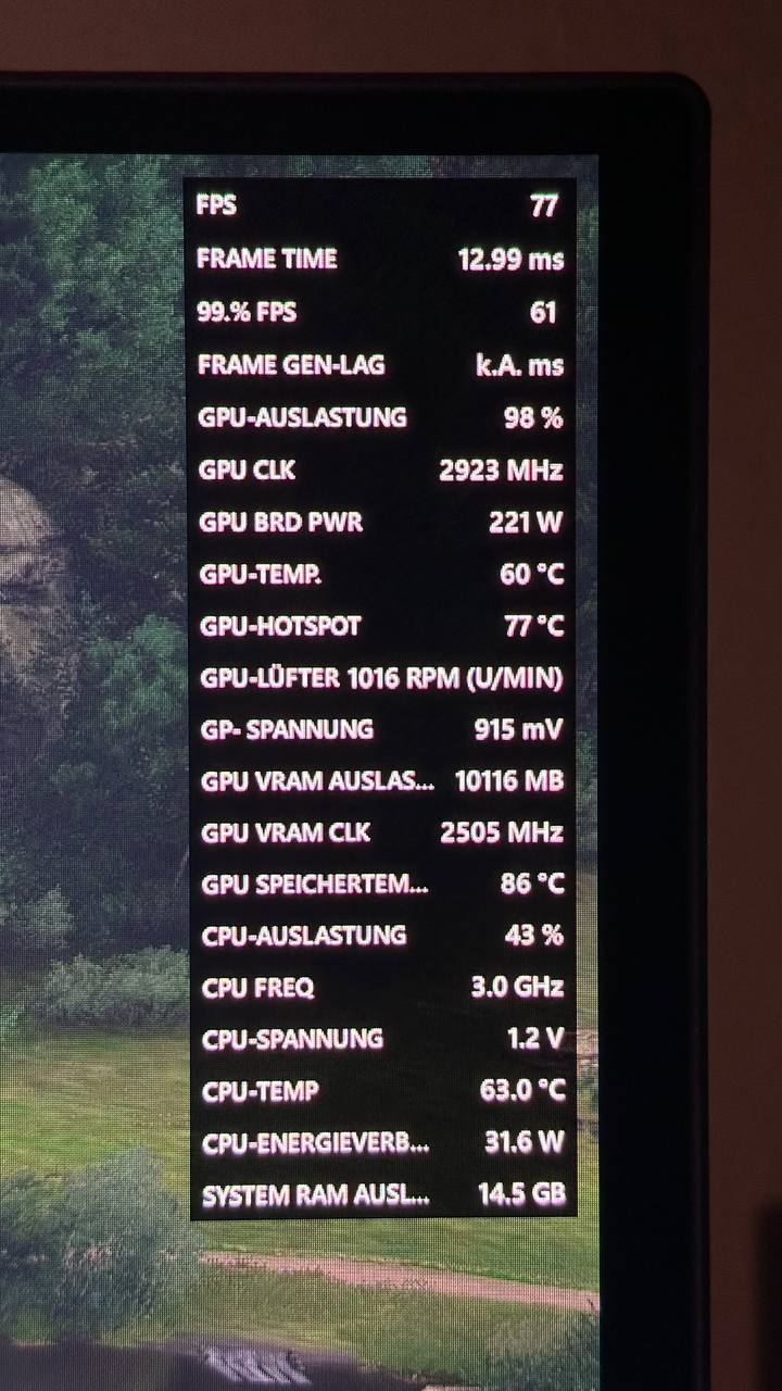 Das Steigerungspotenzial der Effizienz der 9070XT ist wirklich enorm. Anbei Vergleichsscreenshots aus KCD2 mit Stocksettings und mit -100mV bei um 30% reduziertem Powertarget. Ist leider nach ein paar Stunden (!) abgeschmiert, sodass ich aktuell in der Praxis etwas weniger aggressiv undervolte.