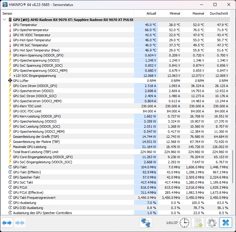 Ich denke, ich werde durch PCIe3.0 etwas ausgebremst, das war bei der 6900XT auch so. Aber diese hat mir problemlos +10% vs. Stock geliefert obwohl ich dort auch einen vglw. mittelmässigen Chip hatte. Von daher finde ich das OCUV bei der 9070XT etwas enttäuschend, aber so ist die Chiplotterie.