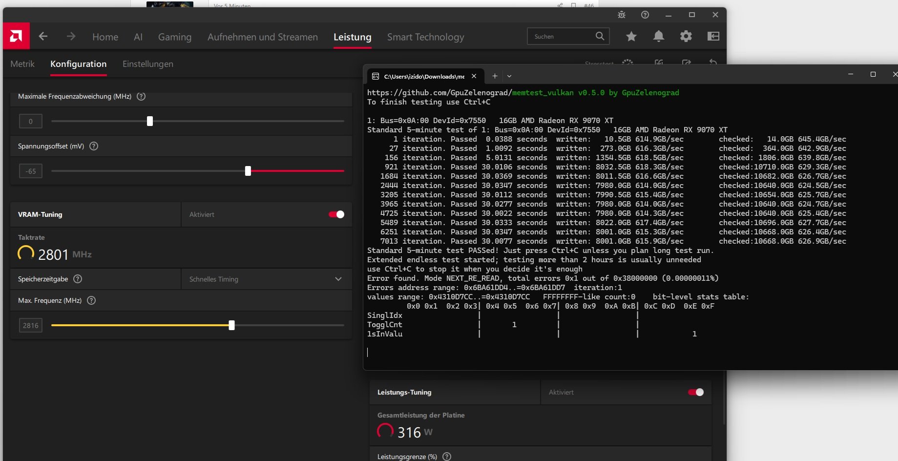 Der 16 GB große GDDR6-Speicher lässt sich auf beiden Grafikkarten gleich gut übertakten. 11.144 MHz laufen noch auf der Radeon RX 9070 Pure stabil, auf der Radeon RX 9070 XT Pure sind es 11.140 MHz. Auch hier stürzt der Rechner bei einem hohen Takt nicht sofort ab, stattdessen nimmt die Performance massiv ab."