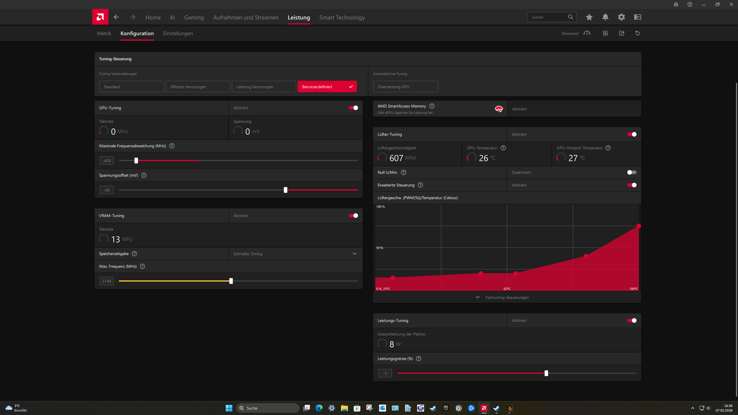 Boost -400Mhz (damit bin ich bei ziemlich genau 3000Mhz maximal, ich finde keinen Vorteil von den hohen Spikes. Man holt sich ggf nur Instabilität ins System)