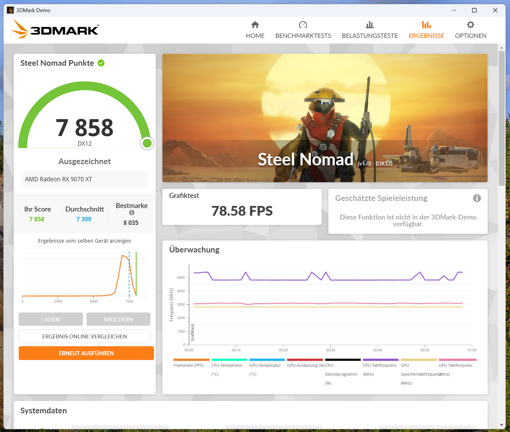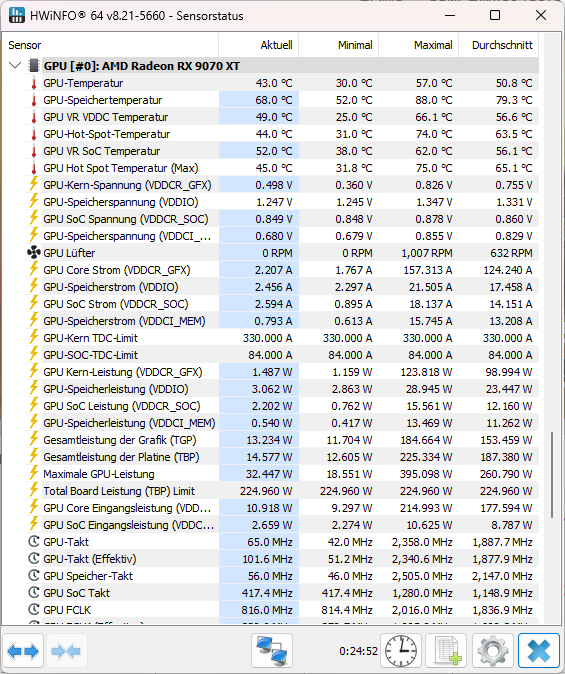 Nach einem Durchlauf des 3DMark Stresstests mit Steel Nomad (verursacht bei mir die höchsten Lastspitzen) kann ich für meine 9070 XT @ 225 W festhalten: