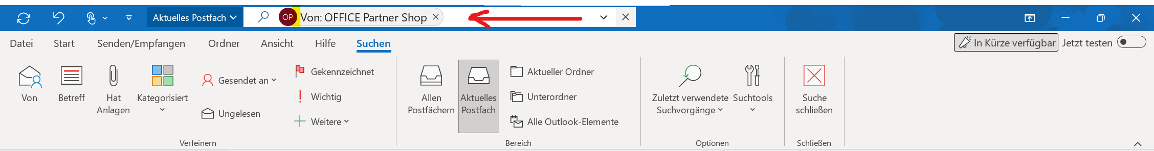 - auf meinem vorherigen Rechner, mit einer anderen Outlook Version, befand sich die Suchleiste für Emails direkt oberhalb der Nachrichten; nicht am oberen Rand der App.