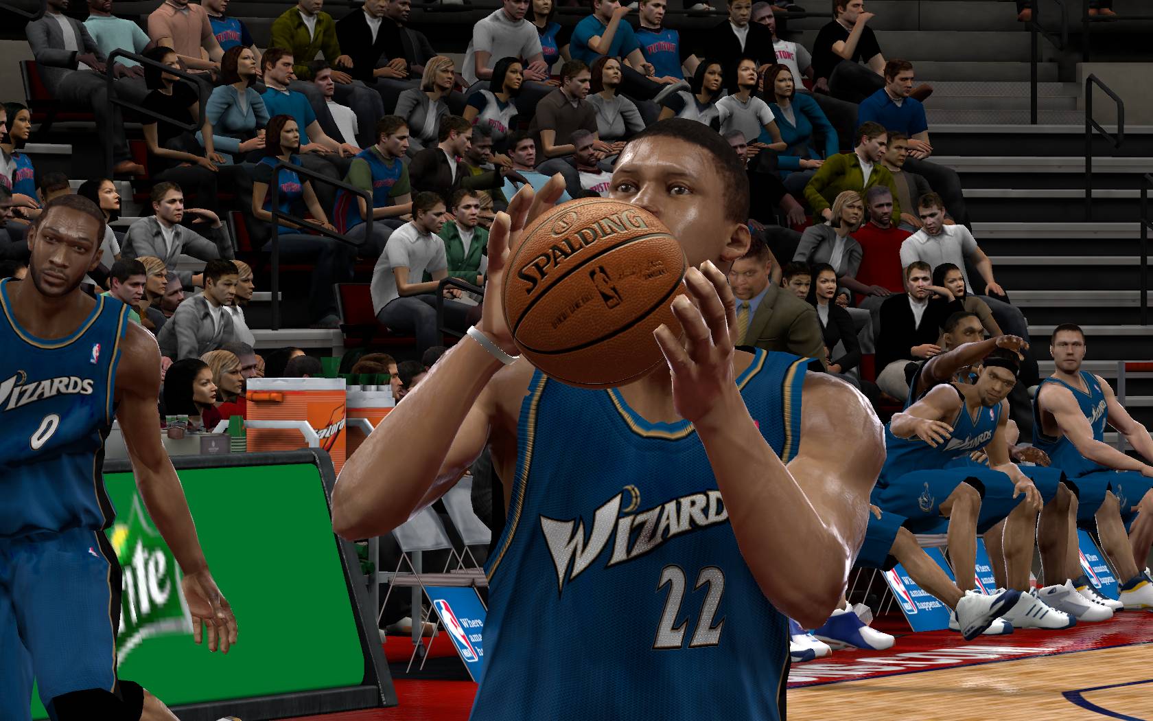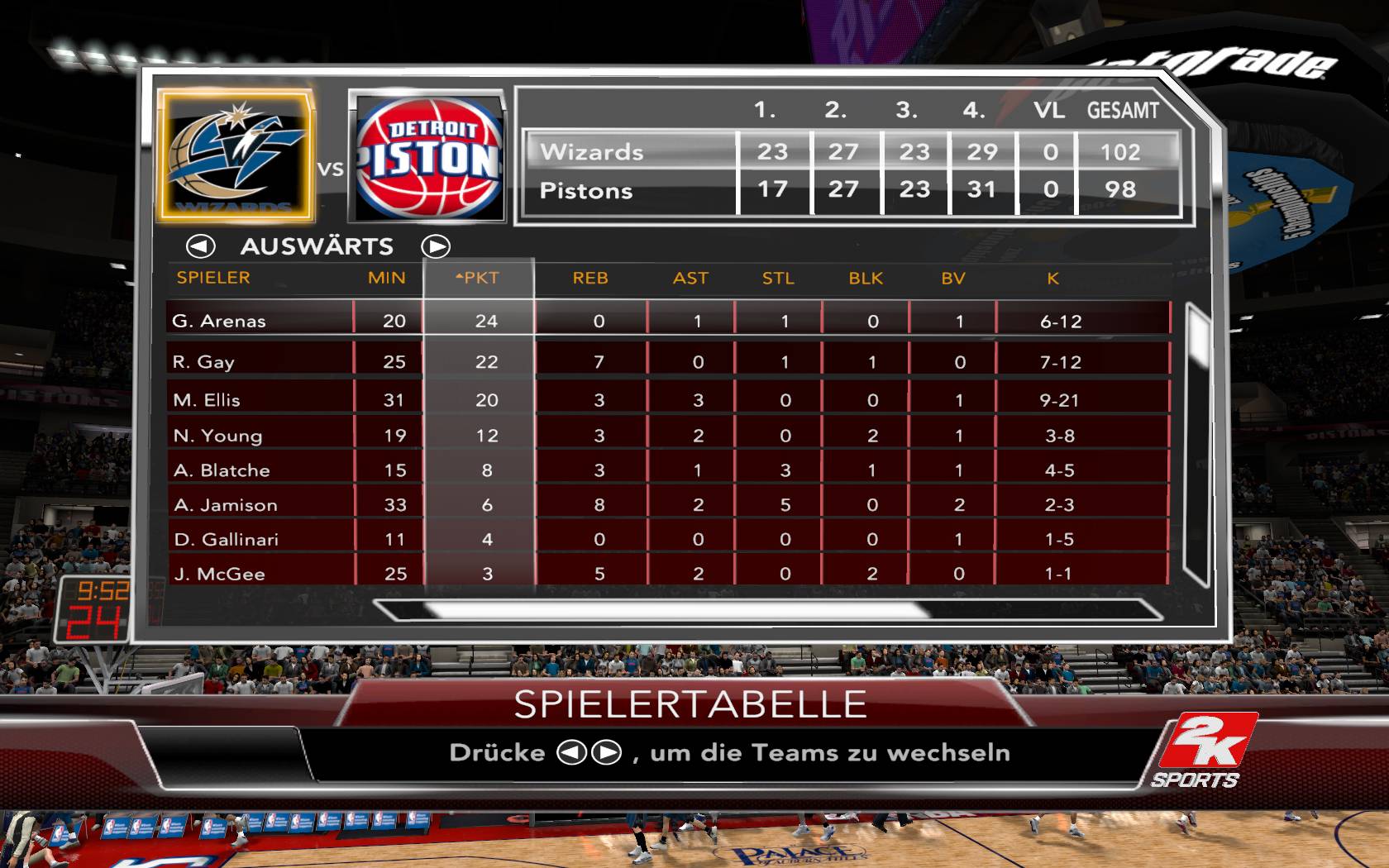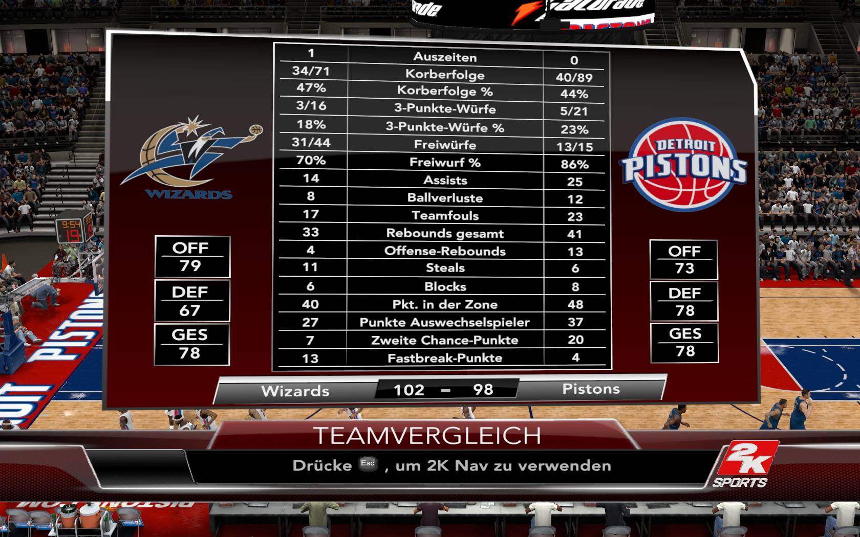 So nochmal ne parallel Association mit >>Juza's Roster<< gestartet, weil mir das Spiel zuvor vom Schwierigkeitsgrad her zu unausgewogen war. Profi zu leicht, Allstar zu schwer. Deshalb also nochmal neu. Erster Eindruck: Es gibt kaum noch Stars. Beispiel: Arenas ist nur noch eine "82", Ellis gar nur eine "81" (Koba und Lebron sind auch keine 99iger mehr). Das Spiel wird auf Allstar insgesamt zäher und weniger actionhaft, aber andererseits hab ich bisher nur einen AlleyOop zusehen bekommen, in zwei Spielen. Nun also hier mein zweites Spiel gegen die Pistons, das erste gegen die Nets konnte knapp gewonnen werde.