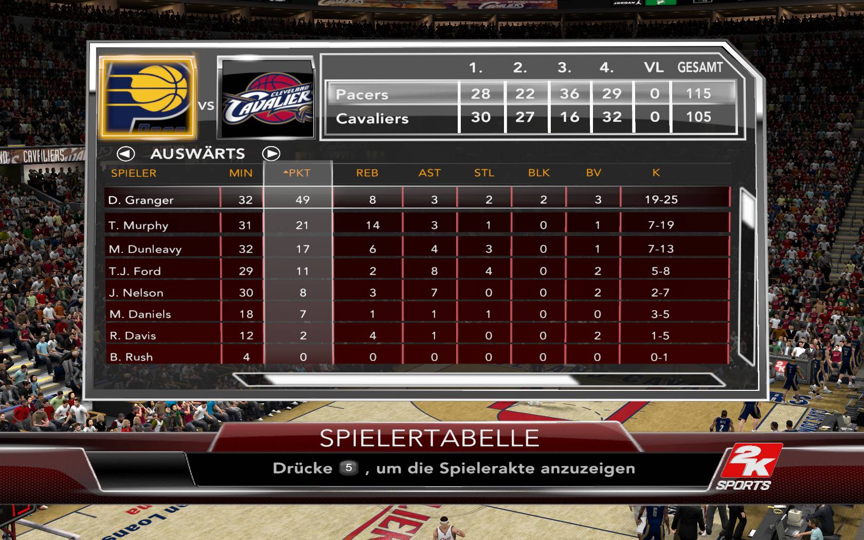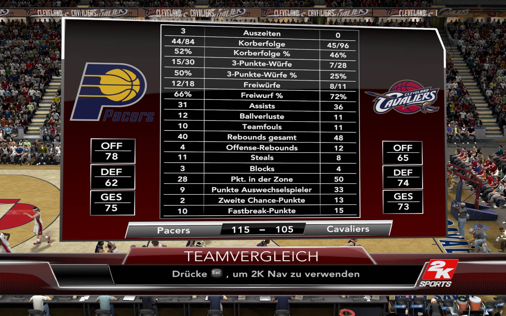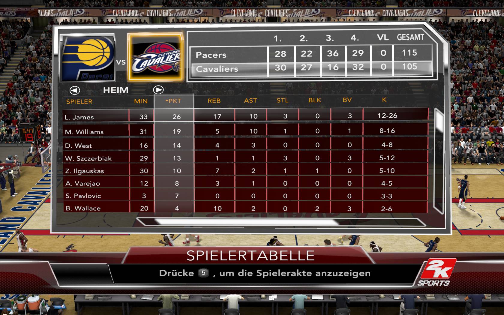 Derzeit bin ich im ersten Viertel gegen die Cavaliers. James lass ich machen was er will (22Pkt im ersten Viertel) und versuche sogut es geht mit Distanzwürfen dagegenzuhalten. Er kann nicht das ganze Spiel durchspielen