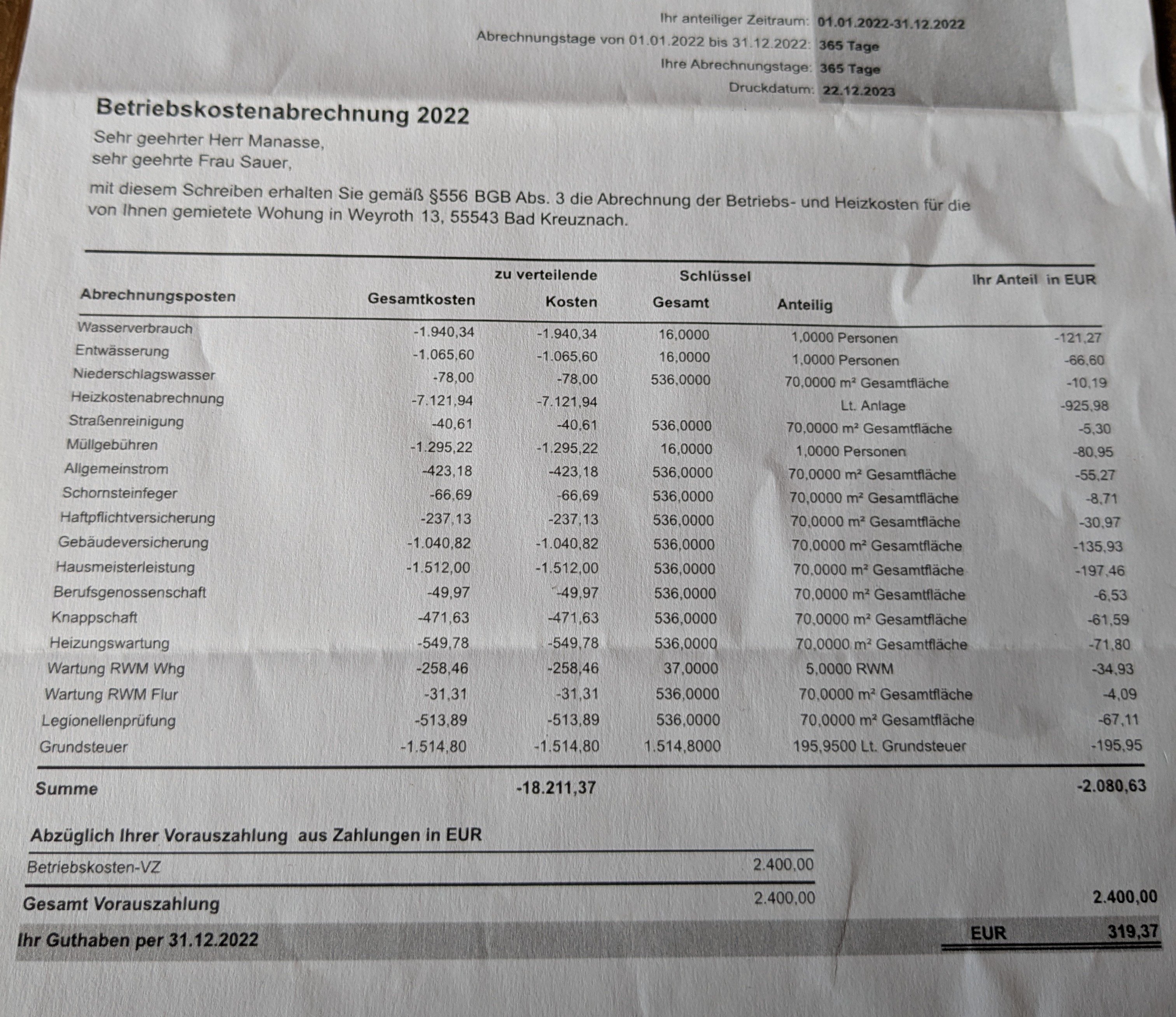 Also lt. der Abrechnung gabs 2023 12 Personen in der Liegenschaft. Da kann ja eine Person mehr nicht deine NK mehr als verdoppeln.