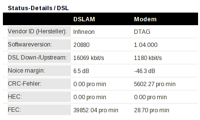 Dort wird mir bei DSLAM eine positive Noice-Margin von etwa 6 dB gezeigt, auf der Modem seite aber ein stark negtiver Wert. Laut meiner Google recherche dürfte ich ja rein theoretisch keine Verbindung ins Internet bekommen. Auch der CRC macht Angst.