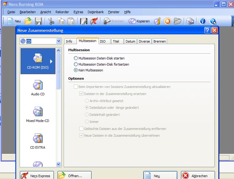 Die eingelegte Disk ist nicht leer, aber der Schreibmodus Ihrer Zusammenstellung ist "Multisession starten" oder "Keine Multisession". Dies wird dazu führen, dass die auf der Disk befindlichen Informationen über den Windows Explorer nicht mehr zugänglich sind. Soll Nero mit dem Schreiben der Disk fortfahren?