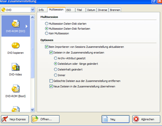 ich habe die Nero Ver 6 und versuche die DVD-R Multisession zu brennen. Vor Tagen hab ich einen DivX Film drauf gebrannt (vor dem Brennen "Ermöglichen das nachträgliche Hinzufügen von Daten ), nun wollte ich heute noch 3 andere Filme dazu brennen jedoch weiß ich nicht wo ich - wie bei der 5er Ver "Multisession Disk fortsetzen" auswählen kann. Wenn ich versuche dennoch die Daten drauf zu brennen kommt, die Disk sei nicht leer, ich soll leere Disk einlegen. Wenn ich jedoch unten "Nachträgliche Hinzufügen der Daten ermöglichen" anhake, kommt folgende Meldung: