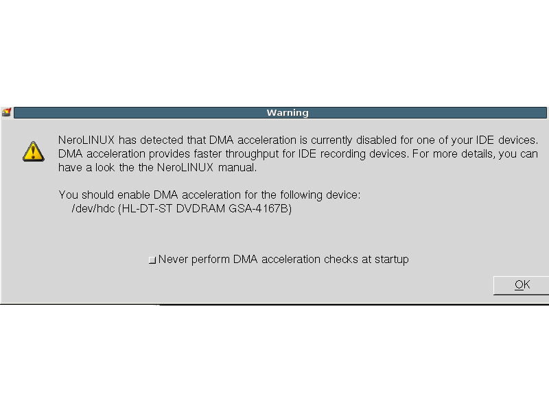 Hi, ich bekomme bei jedem Start von NeroLinux folgenden Hinweis (Bitte Bild im Anhang beachten)