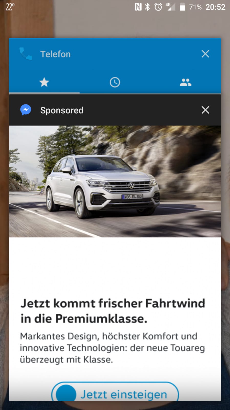 mein kumpel klagt über Werbung welche plötzlich im Andriond OS aufpoppt. Da ich kein androiduser bin kann ich dazu herzlich wenig sagen. Er nutzt Android 7 und hat allen Facebook-Mist deinstalliert. Nur kommen immernoch irgendwelche Werbungen. Und man kann noch das Emblem des messengers sehen. Hat jemand eine Ahnung wo die Werbung herkommt?