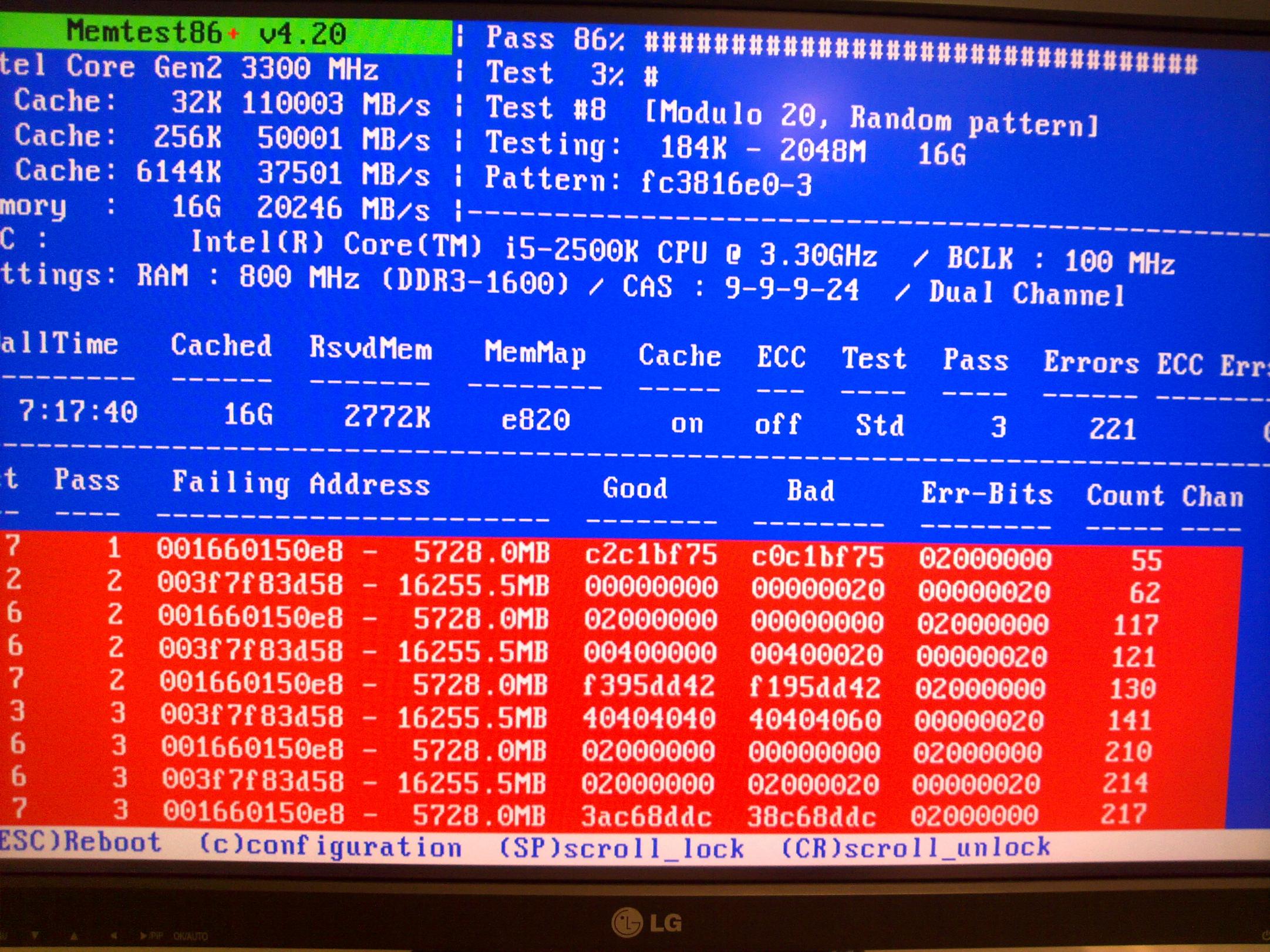 ich habe den in der Signatur angegebenen Mushkin-RAM verbaut. Nach vielen Monaten der scheinbar problemlosen Nutzung hatte ich nach langer Uptime und bei exzessiver RAM-Nutzung (z.B. mehrere Stunden BF3-Multiplayer) seltsame Abstürze. Eine Prüfung mit Memtest86+ brachte dann zum Vorschein, dass es Fehler im RAM gibt, undzwar bei Vollbestückung reproduzierbar im 15-16-GB-Bereich. Seltsamerweise brachte ein Einzeltest der vier Riegel keine Fehler zutage. Auch Tests mit jeweils zwei Riegeln verliefen fehlerfrei. Erst heute habe ich nach mehrwöchiger Nutzung von nur 8 GB die eingebauten gegen die anderen zwei Riegel getauscht und 7:30 h mit sieben Passes Memtest86+ darüberlaufen lassen: kein Fehler!
