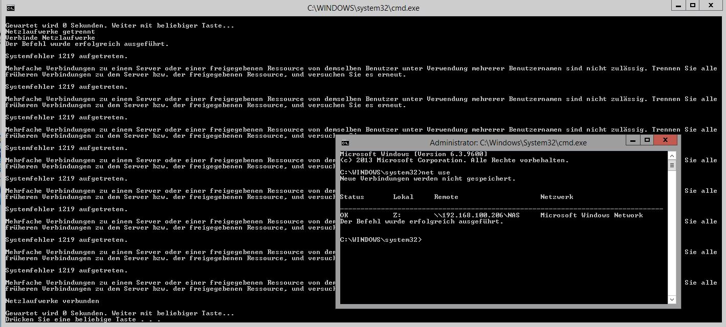 Normalerweise läuft das Script auch ohne Probleme, aber etwa alle 10 Starts wird nur das erste Laufwerk verbunden und die übrigen mit einem Systemfehler 1219 kommentiert. Das sieht dann so aus: