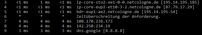 Außerdem habe ich schon den Netcologne Support angeschrieben, aber helfen können die mir nicht... (Bestimmt Routing / Peering Problem seitens NetCologne, anders kann ich mir das nicht erklären).