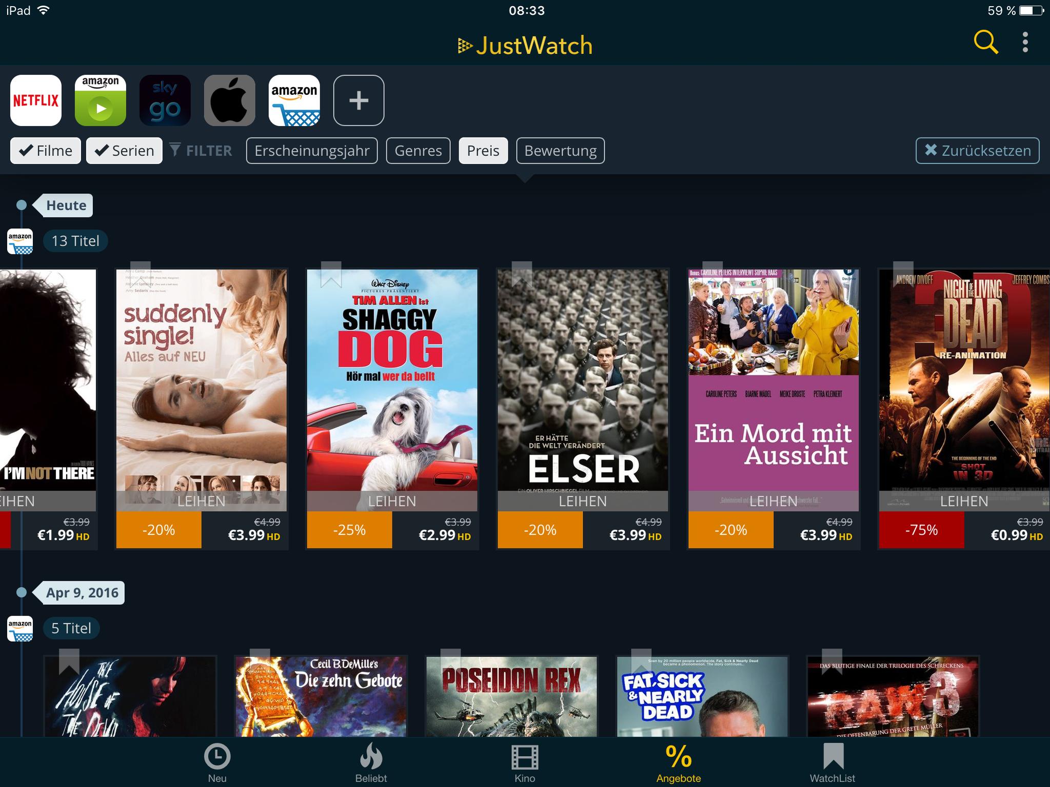Da ich Netflix, Amazon und SkyGo nutze und es nicht so einfach ist den Überblick über Neuerscheinungen und Leihangebote zu behalten, benutze ich inzwischen diese nützliche App auf dem Tablet: justwatch