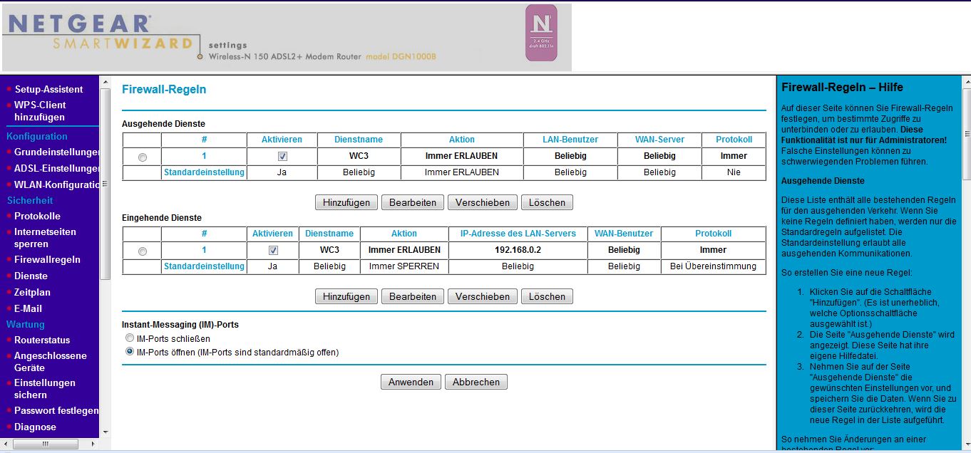 ich bin mit meinem Latein am Ende. Ich möchte den Port 6112 freigeben, um bei Warcraft 3 2on2 spielen zu können. Firewall hat die Warcraft 3.exe als Ausnahme drin. Im Router habe ich "alles wie nötig" eingestellt, trotzdem kann ich Spiele nicht hosten und andere Spieler einladen, ergo Port 6112 ist nicht frei. Ich hatte vorher einen anderen Router, da ging es ohne Probleme, d.h. an der Firewall liegt es nicht. Ich habe die Einstellungen im Router nach folgender Anleitung vorgenommen: http://portforward.com/english/routers/port_forwarding/Netgear/DG834/Warcraft_III.htm.