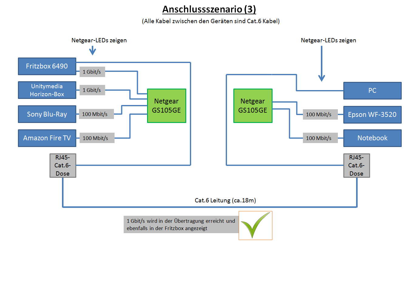 Anbei findet ihr drei Bilder, in welchen Kombinationen ich die Netzwerkkomponenten angeschlossen habe. (1) stellt das gewünschte Anschlussszenario dar, dieses macht aber aus unerklärlichen Gründen Probleme. Die Verbindung zwischen den Netzwerkdosen wird nur als 100-Mbit erkannt.