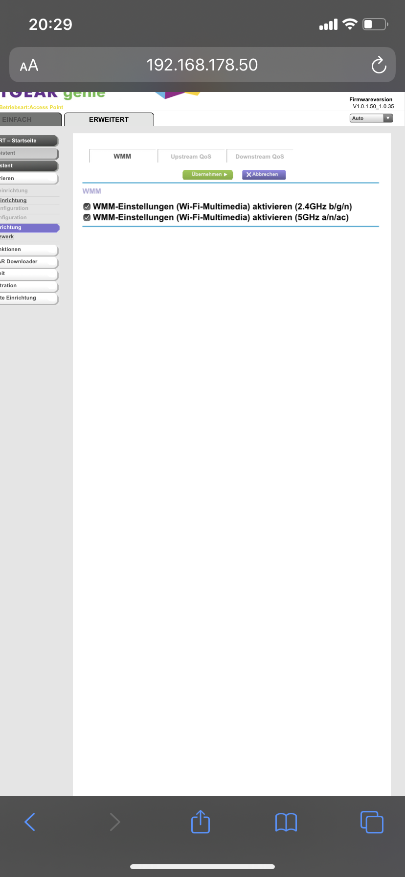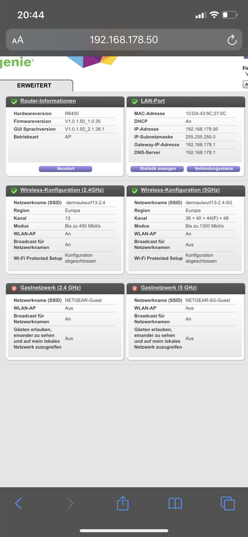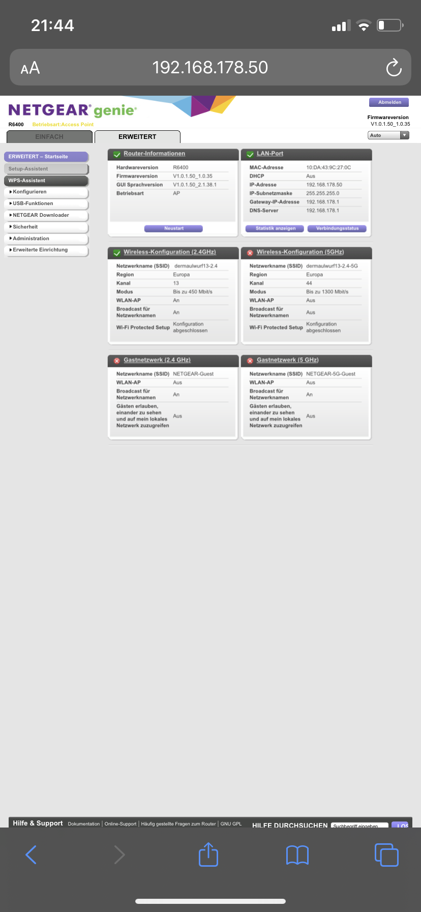 Kurz noch zu meinen Aufbau: Im Keller Telekom Modem (Glasfaser) > Fritzbox (wenn ich hier das Wlan anmache kommt die volle Bandbreite) > Switch > Kabel bis in die Wohnung > Router R6400 > Wlan (mit Kabel volle Bandbreite Wlan wie oben beschrieben)