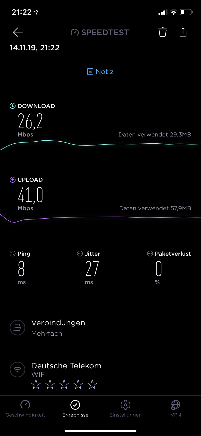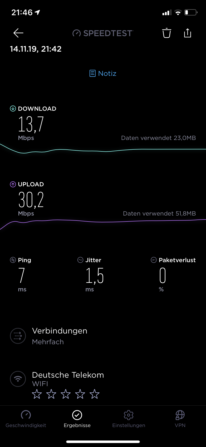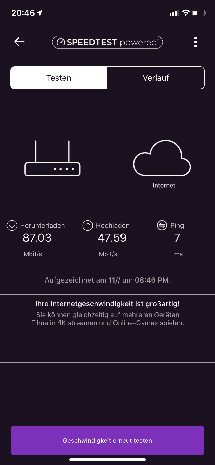 ich habe seit gestern das Problem das meine Wlan Geschwindigkeit nicht mehr über 43,3 Mbps down und 42,1 Mbps Up (dieser ist ja i.o.) kommt. Bei mir würde der Vertrag umgestellt von DSL 50 auf 100. Vor der Umstellung habe ich auch immer mal eine Messung gemacht hier waren die Ergebisse für eine 50er Leitung mehr als gut über Wlan. (54,9 und 11 Mbps) Messungen werden immer direkt neben dem Router gemacht. Das Problem besteht sowohl im 2,4 Netz wie im 5er Netz. Wenn ich auf den Router mit einem Kabel und PC geht habe ich die 100 Mbps und 42 Mbps. Woran kann das liegen das jetzt das Wlan langsamer ist als vorher?