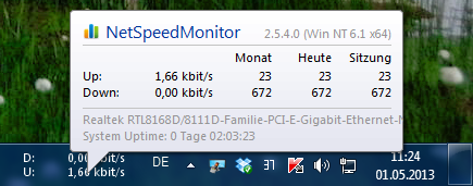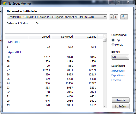 habe mich beim Betrachten meiner Netspeedmonitor Statistiken im April gewundert, warum mein Trafic so hoch ist. Heute sehe ich nun für Mai einen Monatstraffic von 339 GB obwohl der Monat ja erst einen Tag jung ist und der Rechner die ganze Nacht aus war. Übersehe ich da etwas?